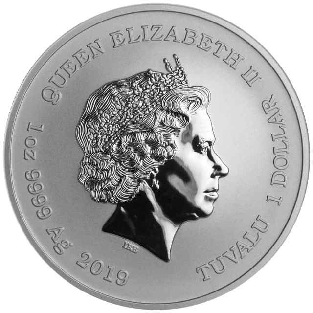 Awers zdobi portret królowej Elżbiety II autorstwa Iana Rank-Broadleya, wraz z nominałem 1 dolar, nazwą emitenta – Tuvalu – oraz rokiem emisji: 2019.