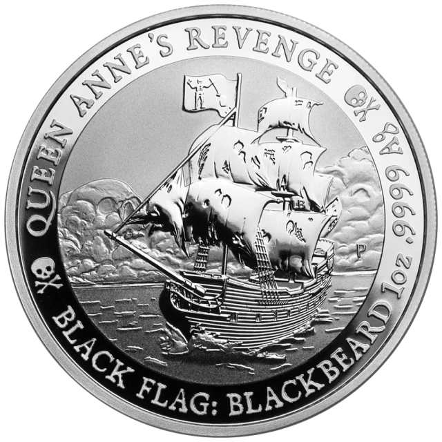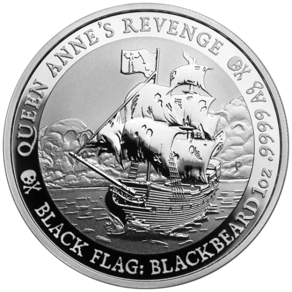 Statek ten, operujący na wodach Atlantyku na początku XVIII wieku, zasłynął z licznych abordaży i budził postrach wśród żeglarzy. Na rewersie monety widnieje dynamiczna scena – potężny żaglowiec sunący przez wzburzone morze z rozwiniętą czarną flagą, na tle burzowego nieba, w którym ukazuje się złowroga czaszka. Kompozycję uzupełniają napisy: „QUEEN ANNE’S REVENGE”, „BLACK FLAG: BLACKBEARD”, a także oznaczenia wagi, próby srebra i znak mennicy Perth Mint.