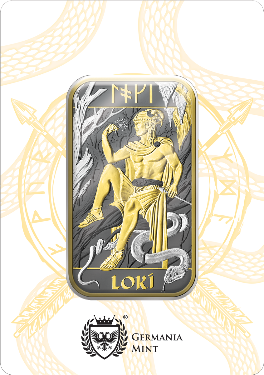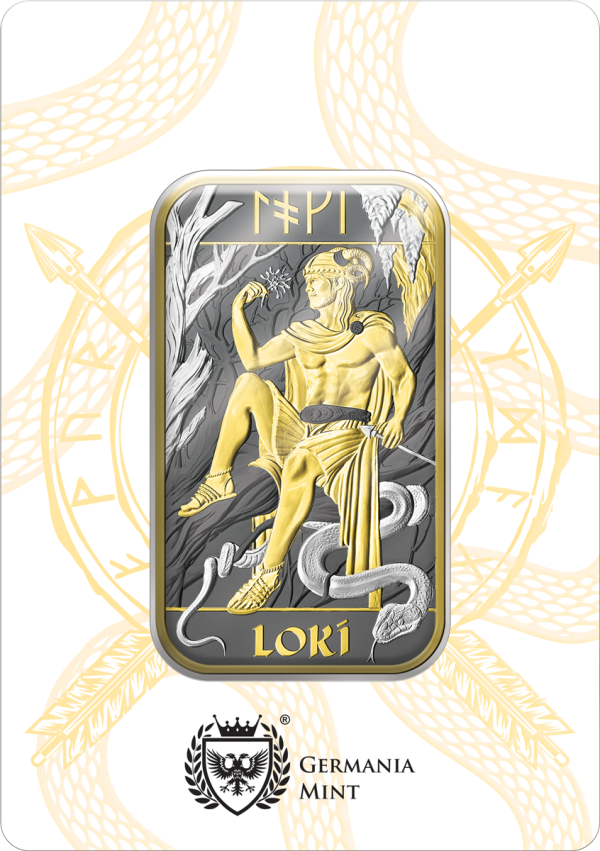Prezentujemy uszlachetnioną srebrną sztabkę z serii Nordyccy Bogowie – Loki, będącej połączeniem najwyższej jakości srebra oraz unikalnego projektu autorstwa The Royal Mint, zamknięte w eleganckim opakowaniu od Germania Mint.