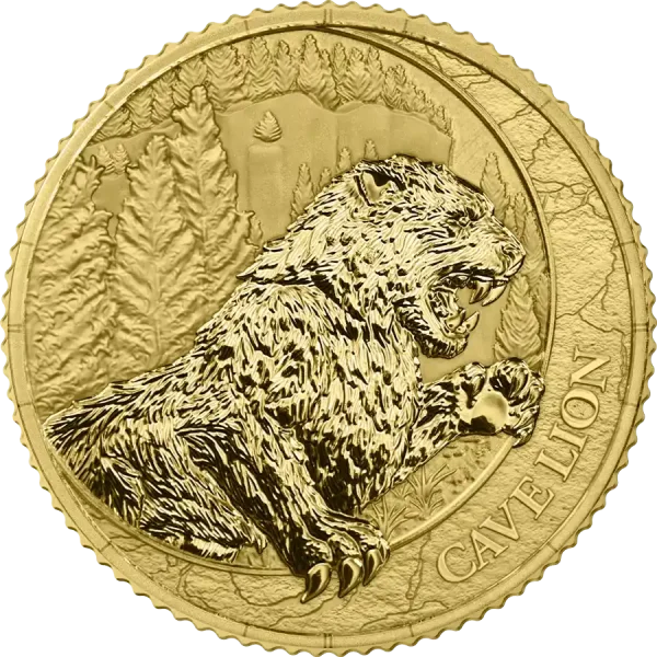 Bohaterem jest lew jaskiniowy – potężny drapieżnik epoki lodowcowej, który tysiące lat temu dominował na stepach Europy i Azji. Większy od współczesnych lwów, ten wymarły gatunek stał się symbolem pierwotnej siły i dzikości, co doskonale oddaje unikalny projekt monety.