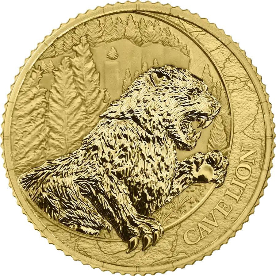 - Rewers monety przedstawia wizerunek lwa jaskiniowego w realistycznej pozie, która podkreśla jego muskularną sylwetkę i drapieżny charakter. Lew jaskiniowy to jeden z największych drapieżników epoki lodowcowej. Żył on na terenie Europy i Azji i charakteryzowała go niezwykła siła i wytrzymałość. Precyzyjny relief oddaje dzikość oraz monumentalny charakter tego imponującego kota. Całość przyciąga wzrok i wyróżnia monetę na tle klasycznych emisji bulionowych.